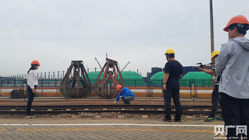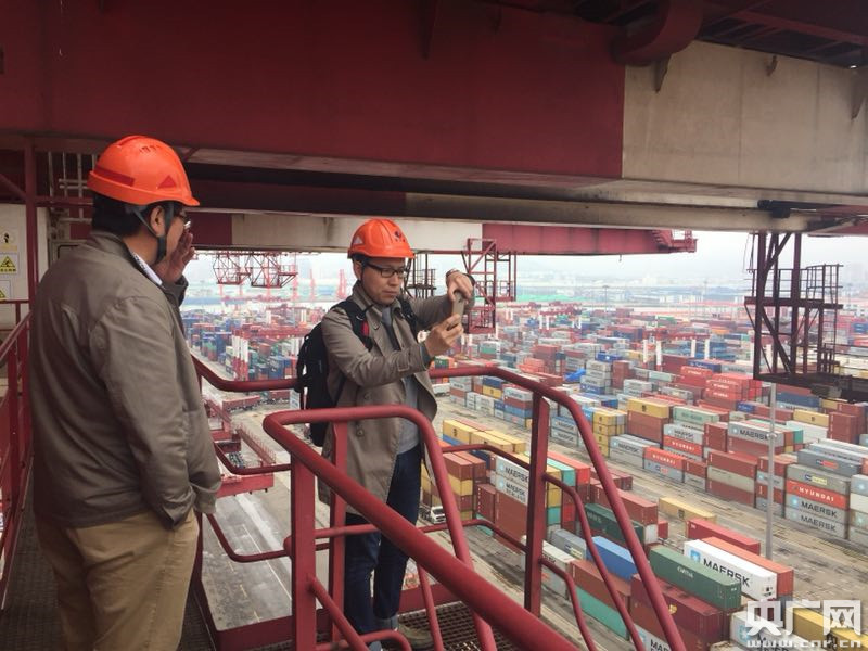 央廣記者柴安東(右一)、央視攝像趙迎晨(左二)在采訪陸橋國際貨運(yùn)代理有限公司報(bào)關(guān)中心經(jīng)理王欣(右二)