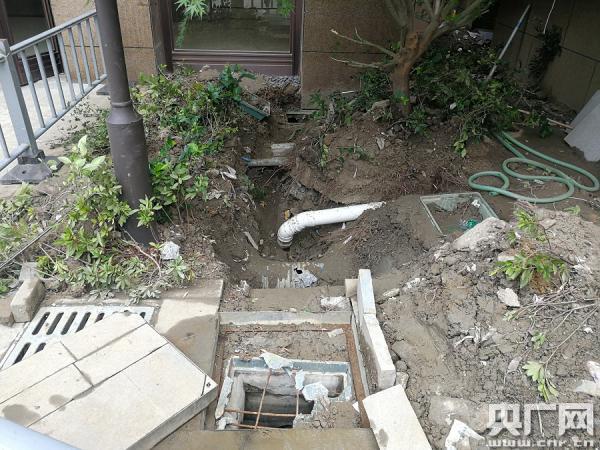 業(yè)主跟開發(fā)商僵持不下。這時(shí),由江北區(qū)城管局和住建局牽頭,要求開發(fā)商派人把一號(hào)樓樓下的一個(gè)污水井和雨水井之間的部分刨開,驗(yàn)證到底兩個(gè)管道是否相連。
