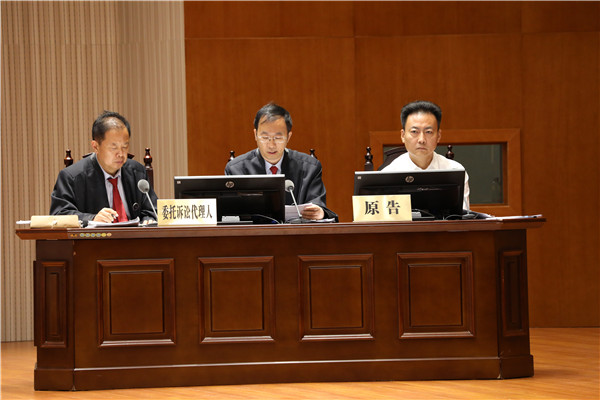 庭審現(xiàn)場(chǎng):濮陽(yáng)市市長(zhǎng)楊青玖(右一)代表原告出庭,并在現(xiàn)場(chǎng)發(fā)表陳述意見(jiàn)(央廣網(wǎng)發(fā) 濮陽(yáng)市中級(jí)人民法院供圖)