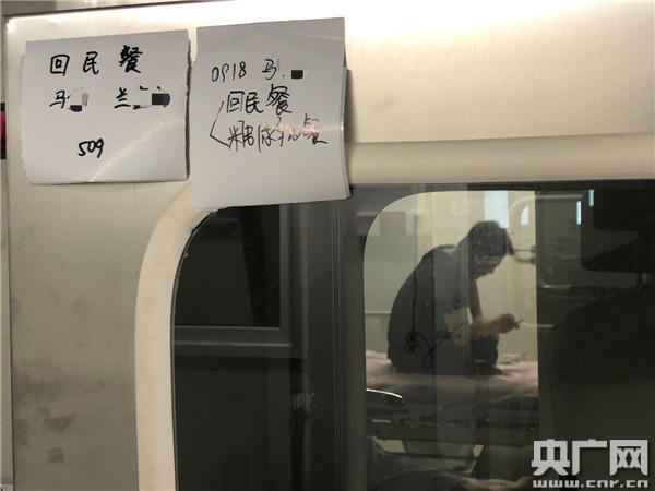 記者探訪第五病區(qū),從清潔區(qū)的內(nèi)走廊,透過玻璃窗可以看見患者在病房里走動,躺在床上看手機,或者請醫(yī)護人員幫忙調(diào)試床邊的小電視,還有患者對著記者的鏡頭揮手微笑。病房和清潔區(qū)之間沒有門進出,只有一個消毒傳遞柜,內(nèi)外兩扇門能先后打開,患者的一日三餐通過中間的可消毒空間傳遞。柜門上寫著一些特殊的飲食需求:清真餐、糖尿病餐,不吃米飯只要饅頭大餅等。