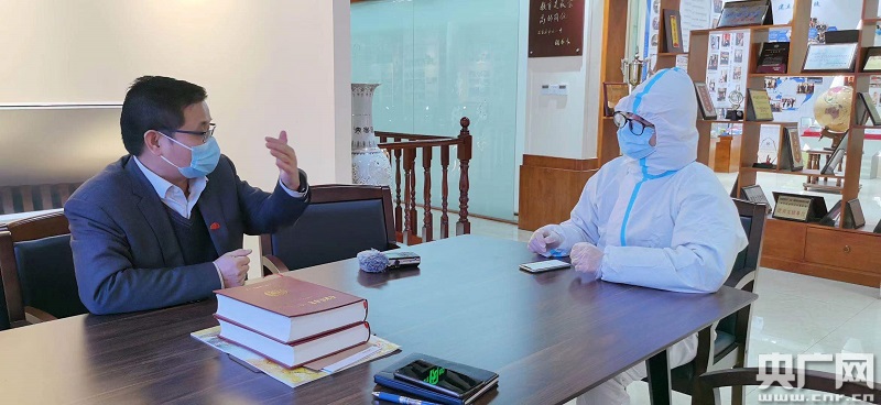校長(zhǎng)婁延果接受總臺(tái)央廣記者采訪(按照防疫要求進(jìn)入學(xué)校的人員必須穿戴防護(hù)服)