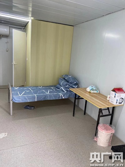 首批隔離用房已經(jīng)交付。走進(jìn)隔離房,約18平方米的空間內(nèi),生活設(shè)施齊備。河北建工集團(tuán)項(xiàng)目經(jīng)理翟東澤介紹:“現(xiàn)在這個(gè)房間的配置,有一些必備的生活用品,有一張床、一套桌椅以及一個(gè)電視,還有一個(gè)整體的衛(wèi)浴設(shè)備,可以洗漱、淋浴,熱水器等都是配備齊全的。”