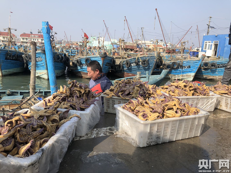 在青島市城陽區(qū)紅島漁港碼頭,記者看到很多漁船在穿梭忙碌,一船船的海星也被源源不斷地運(yùn)往岸邊。工人們稱重、裝箱,把剛剛上岸的海星裝上卡車運(yùn)走。一位負(fù)責(zé)出海打撈海星的漁民告訴記者,他們兩條船一天就可以打撈3000多斤。