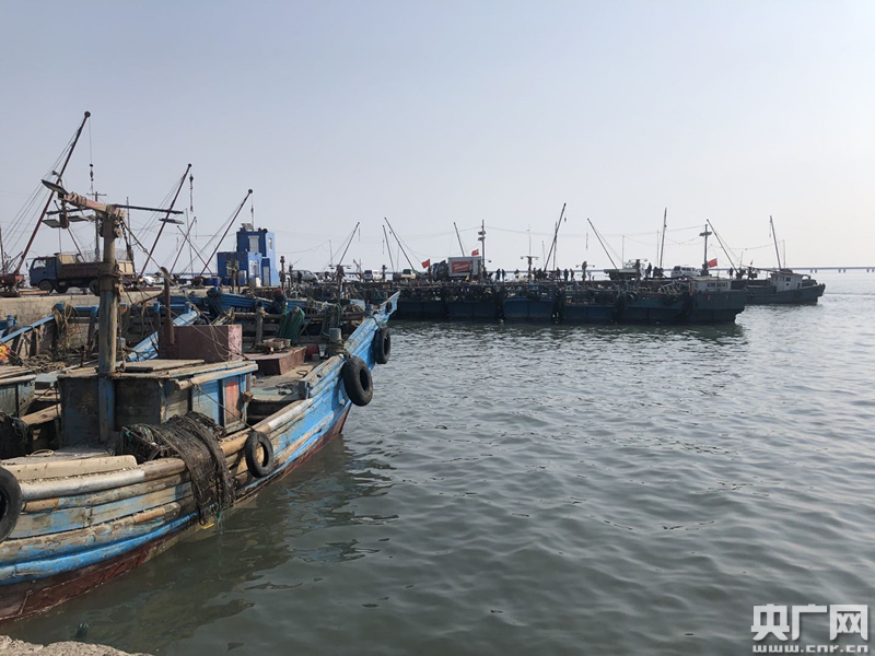 青島紅島漁港碼頭,多艘漁船往來打撈運(yùn)送海星(記者王偉 攝)