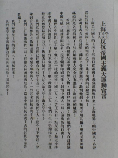 《上海學(xué)生市民工人反抗帝國(guó)主義大運(yùn)動(dòng)宣言》傳單這樣寫道:“上海是中國(guó)人的上海!然而自從帝國(guó)主義強(qiáng)迫開埠以來,上海租界上的中國(guó)人,蜷伏于帝國(guó)主義的壓迫之下,比十幾國(guó)的奴隸還不如!……我們已經(jīng)預(yù)備犧牲一切,冒犯各種困難與危險(xiǎn),為全中國(guó)反抗帝國(guó)主義的民族革命作前驅(qū)!”