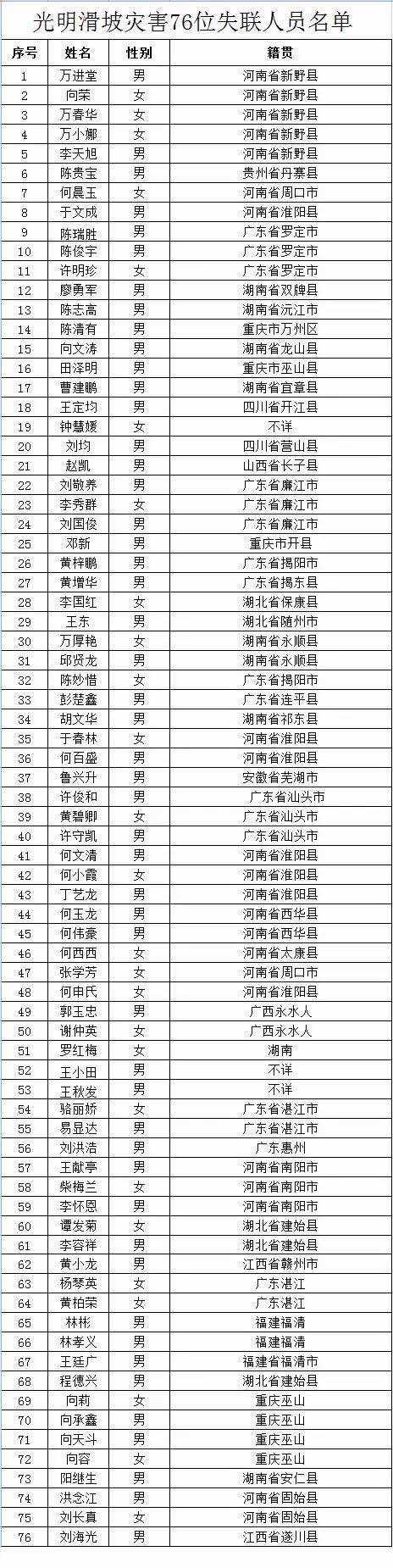 深圳山體滑坡災(zāi)害76人失聯(lián)人員名單公布
