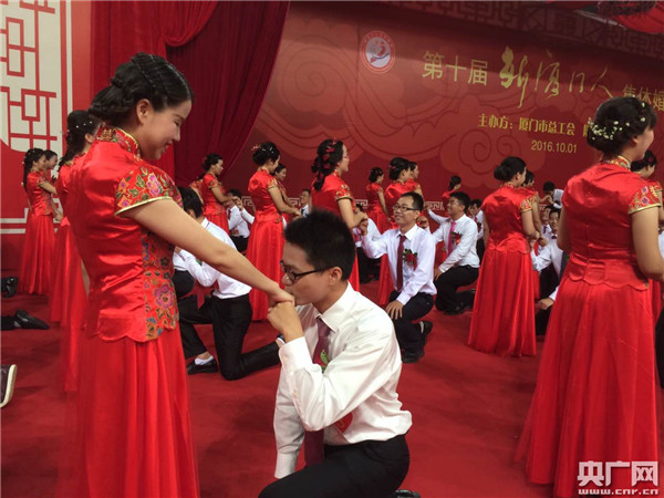 央廣網(wǎng)廈門(mén)10月1日消息(記者陳庚)據(jù)中國(guó)之聲《央廣新聞》報(bào)道,今天上午,第十屆“新廈門(mén)人”集體婚禮在廈門(mén)市工人體育館舉行,廈門(mén)市相關(guān)領(lǐng)導(dǎo)為百對(duì)新人證婚。
