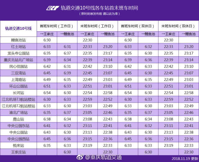 軌道10號線各車站首末班車時間。圖片來自重慶軌道集團官方微博