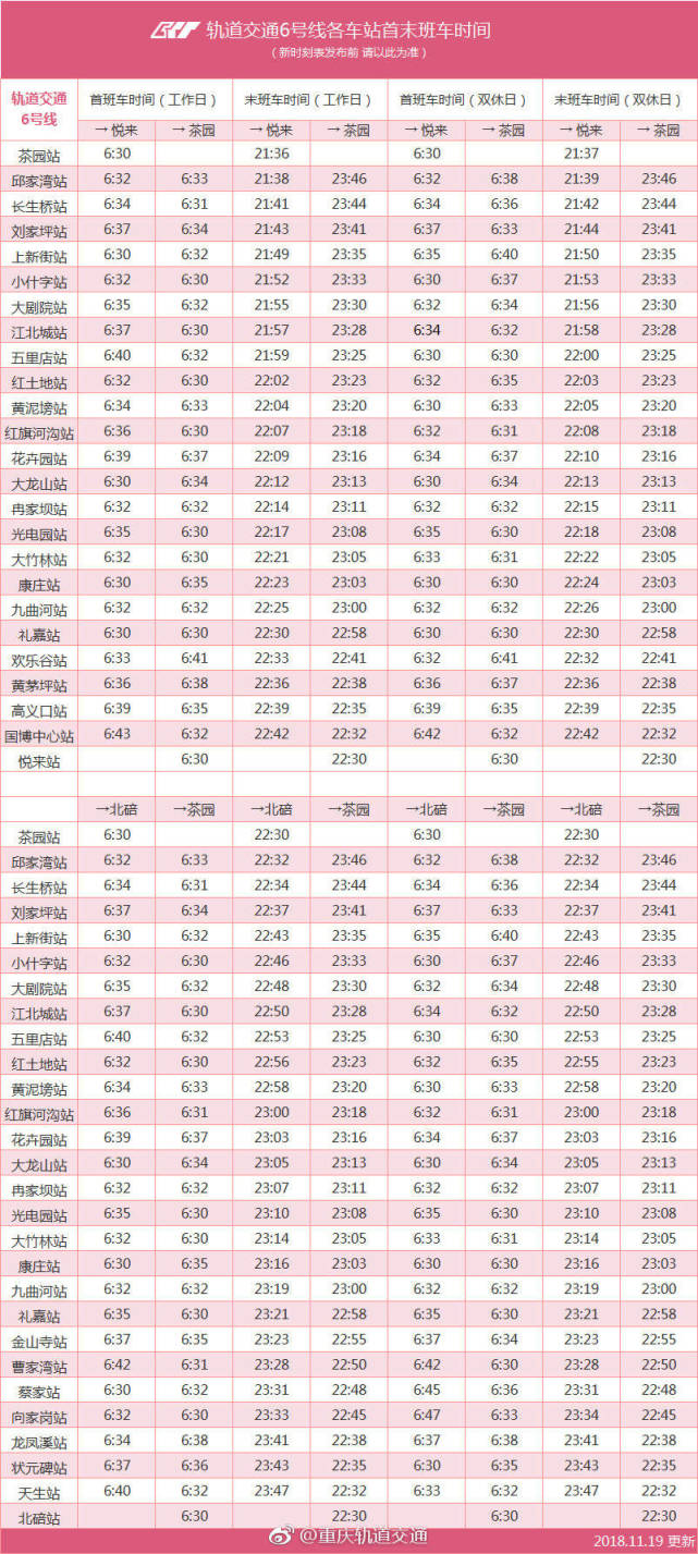 軌道6號線各車站首末班車時間。圖片來自重慶軌道集團官方微博