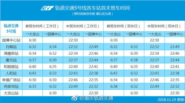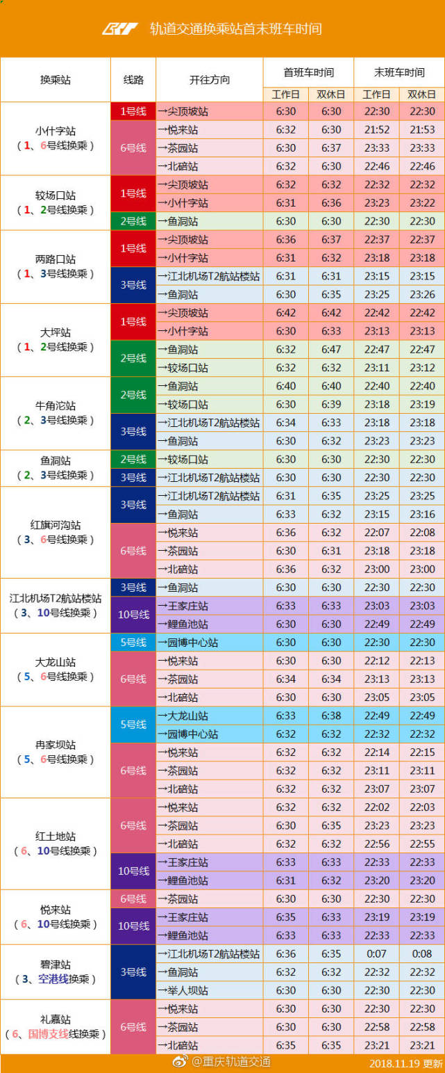 軌道換乘站首末班車時間。圖片來自重慶軌道集團官方微博
