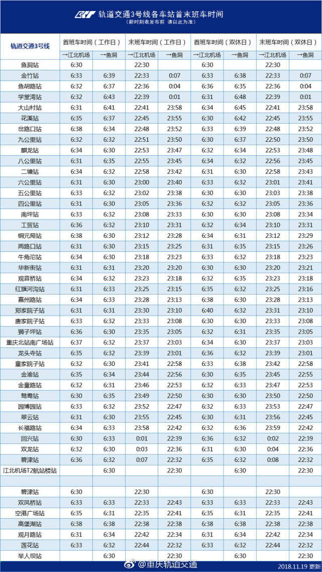 軌道3號線各車站首末班車時間。圖片來自重慶軌道集團官方微博