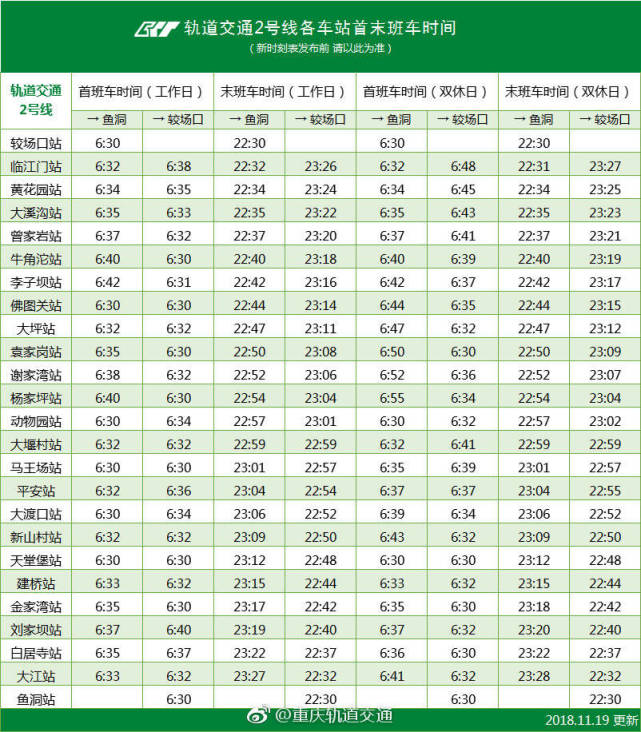 19日,重慶軌道集團官方微博發(fā)布了重慶軌道交通已運營線路的首末班車時間表?靵砜纯矗灰e過乘車時間喲。