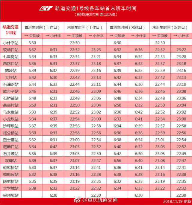 軌道1號線各車站首末班車時間。圖片來自重慶軌道集團官方微博
