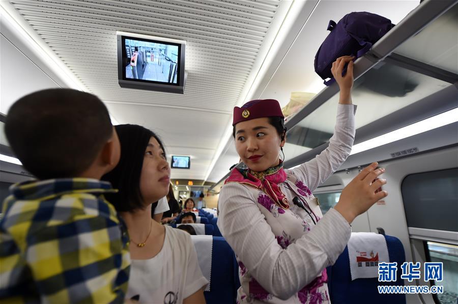 5月2日,在重慶火車北站,一對(duì)乘坐高鐵的母子通過(guò)“成渝高鐵”微客服得到乘務(wù)員的重點(diǎn)照顧。新華社記者唐奕 攝 -
