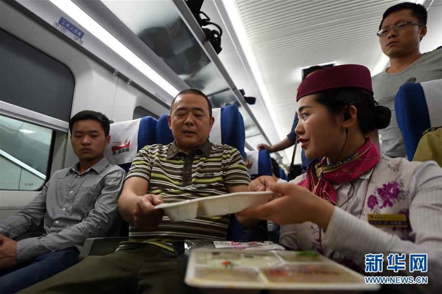 5月2日,在重慶火車北站,一位乘坐高鐵的旅客通過(guò)“成渝高鐵”微客服訂餐,乘務(wù)員按時(shí)將盒飯送至旅客的座位。新華社記者唐奕 攝