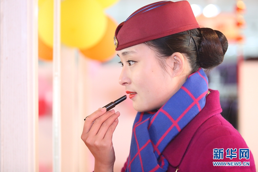 蔣紅為即將開始的“第一次”春運(yùn)精致妝容。新華網(wǎng)發(fā) 包亮攝   新華網(wǎng)重慶2月11日電(唐詩雪 胡慧)春運(yùn)的帷幕已徐徐拉開,返鄉(xiāng)的熱潮如期而至,作為高鐵上的“動妹”,也在平凡的崗位上奉獻(xiàn)著屬于她們的不平凡。重慶客運(yùn)段動車一隊列車員蔣紅便是如此。   蔣紅,一位活潑開朗的90后,雖然今年春運(yùn)是她的第一次春運(yùn),但她信心十足。出乘當(dāng)日,凌晨五點(diǎn)的鬧鐘準(zhǔn)時響起,蔣紅快速起床,15分鐘完成洗漱化妝,然后便前往學(xué)習(xí)室集合,做好出乘準(zhǔn)備。   蔣紅所值乘的列車平均每天往返成渝線4次,共計8趟,平均每趟要來回巡視車廂10余次,車門迎客、整理行李架、安全宣傳、到站前播音也都一件不落的依次進(jìn)行著。一趟車下來,諸多的“第一次”讓蔣紅既感興奮又覺疲憊。但她留給旅客最好的印象便是喜歡微笑,她說:“我很喜歡笑,因為溫暖的笑既能讓他人覺得親近,自己也能從中得到滿足!   在春運(yùn)里,像蔣紅這樣的“動妹”還有很多,對于客運(yùn)工作,她們由最初的陌生到熟悉,她們懂得從“枯燥”的工作中找尋到不一樣的快樂。用蔣紅的話說:“最初總是從新聞上,家人口中聽聞高鐵和春運(yùn),到現(xiàn)在親身感受,心里很激動和自豪。以前總以為列車員好輕松,做的事也很簡單,現(xiàn)在才知道并沒有想的那么容易。雖然是第一次春運(yùn),但在車上學(xué)到了很多技巧和前輩傳授的經(jīng)驗,對我來說這是很寶貴的財富,也讓我更加得心應(yīng)手!
