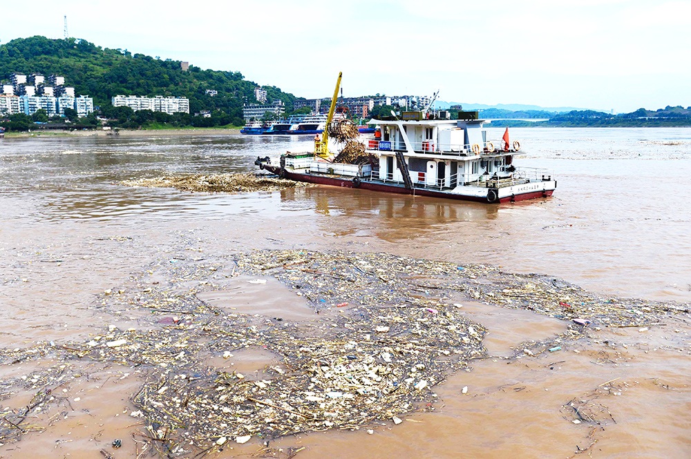 7月10日,長江郭家沱滾裝船碼頭,水上環(huán)衛(wèi)工駕駛機械化專業(yè)清漂船抓取江面上的漂浮垃圾。隨著洪水過境,加之地勢原因,漂浮垃圾大量聚集在郭家沱水域。據(jù)介紹,這里的三艘機械化專業(yè)清漂船配備14名環(huán)衛(wèi)工,每天早上7點開始作業(yè),一直要忙到天黑,每天清理垃圾近80噸,是平時的2.5倍。記者 張錦輝 攝