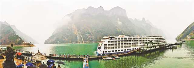2019年3月13日,在長江三峽巫山境內(nèi)的巫峽,一艘豪華游輪?吭谏衽迓糜未a頭。通訊員 盧先慶 攝