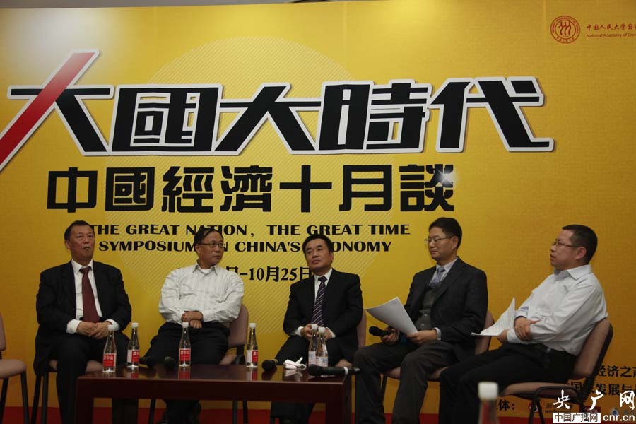 10月16日,由經(jīng)濟(jì)之聲、央廣網(wǎng)主辦的《大國大時代----中國經(jīng)濟(jì)十月談》系列時事報告會之四“價格談”,在人民大學(xué)舉行。圖為圖為國務(wù)院參事室特約研究員姚景源、國家信息中心首席經(jīng)濟(jì)師范劍平、國家發(fā)改委價格司副司長周望軍、中國人民大學(xué)財政金融學(xué)院副院長趙錫軍、經(jīng)濟(jì)之聲觀察員陳愛海(由左至右排序)(央廣網(wǎng) 趙娜娜/攝)