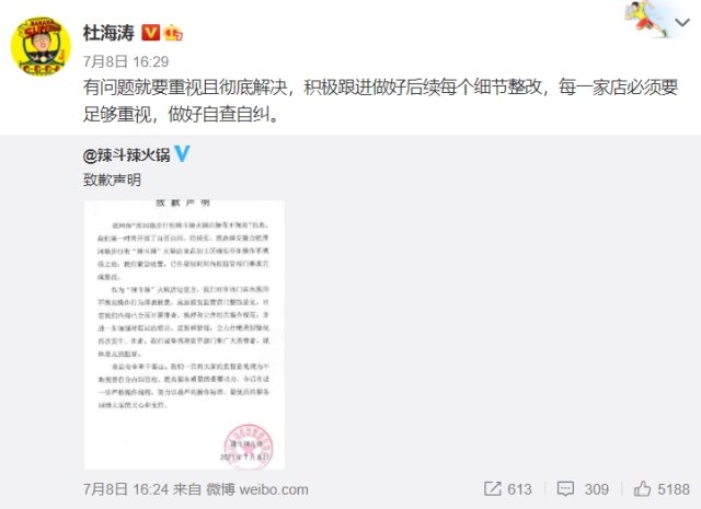 同樣讓人覺得“吃了蒼蠅”的,還有杜老板神氣的表態(tài)。面對監(jiān)管部門清楚明白的責令停業(yè),“辣斗辣”火鍋官方微博還“就網(wǎng)傳……第一時間開展了自查自糾”,好像不是問題被捅出來,而是自己多么精益求精、不斷改進似的。杜老板直接轉(zhuǎn)發(fā)這條“致歉聲明”稱,“有問題就要重視且徹底解決,積極跟進做好后續(xù)每個細節(jié)整改,每一家店必須要足夠重視,做好自查自糾”,沒有對消費者的道歉,沒有對旗下品牌管理不善的反思,他怕是忘了甩手掌柜名義上也是品牌的一分子。