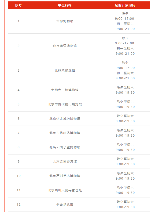 北京市文物局局屬博物館春節(jié)期間延時開放單位名單