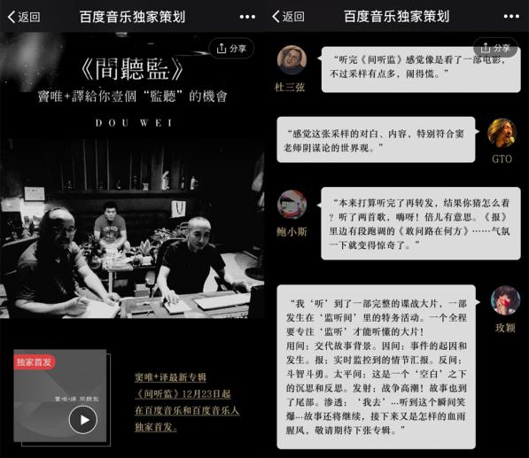 23日專輯首發(fā)后,百度音樂就發(fā)起了“竇唯+譯給你一個(gè)‘監(jiān)聽’的機(jī)會(huì)”專題活動(dòng),引導(dǎo)用戶發(fā)布從《間聽監(jiān)》中“監(jiān)聽”到的內(nèi)容評論,不少人都在專題后留下了自己的感受。