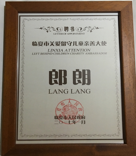 慈善音樂(lè)會(huì)現(xiàn)場(chǎng),臨夏市人民政府邀請(qǐng)郎朗擔(dān)任“臨夏市關(guān)愛(ài)留守兒童公益親善大使”,臨夏州委常委、臨夏市委書(shū)記曹正民向郎朗頒發(fā)“臨夏市關(guān)愛(ài)留守兒童親善大使”聘書(shū),臨夏市人民政府市長(zhǎng)郭維安與郎朗共同為臨夏市關(guān)愛(ài)留守兒童公益基金揭牌。
