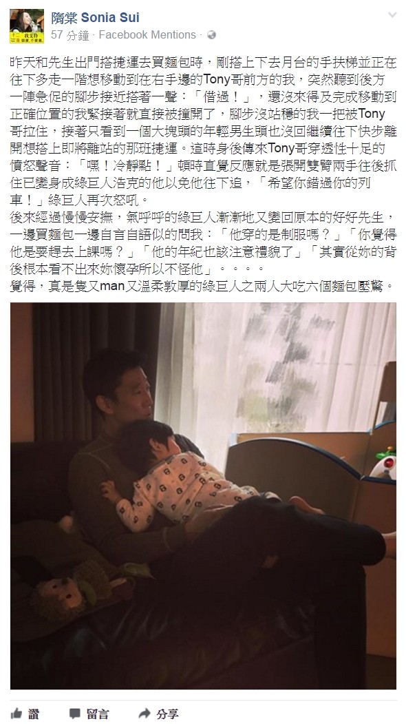 隋棠22日在臉書(shū)寫(xiě)下長(zhǎng)文,昨天和Tony搭著捷運(yùn)準(zhǔn)備要出門(mén)時(shí),搭上下月臺(tái)的手扶梯時(shí),原先和老公并肩的她,正要往下一階到右前方時(shí),突然聽(tīng)到后面?zhèn)鱽?lái)急促的腳步聲配上一句:“借過(guò)!