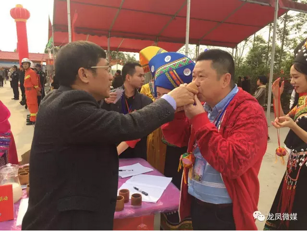 貴港市港北區(qū)委宣傳部部長陸雨與與會來賓敬糯米甜酒,這是當?shù)匾环N對來賓的熱情致敬的歡迎禮儀