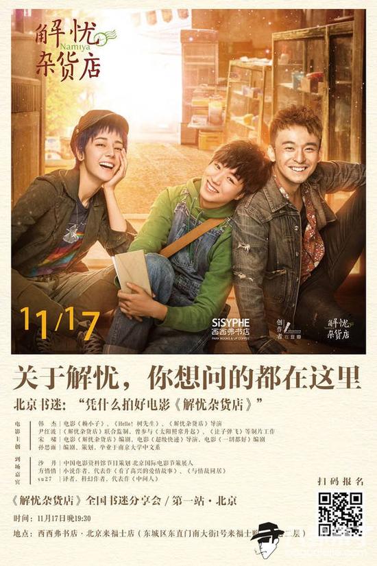 書迷路演會于17日晚在北京西西弗書店舉行,特邀嘉賓作家方悄悄、譯者su27此次給主創(chuàng)出難題,犀利“拷問”不斷。由于《解憂雜貨店》的原著具有典型的日式治愈風(fēng)格,方悄悄對原作是否適合本土影視化提出疑問。對此韓杰表示,影視化的改編一定是對原著小說的高度尊重,才會有探索性的改造,“在改這個電影的時候,我抓住兩個點,一個是類型上給它做成青春勵志類型,另一個還是講中國式情感,無論是西方小說,還是日本小說,凡是轉(zhuǎn)譯到中國這個故事上,你不能丟到中國文化的根! 此外,中日文化同根相連,韓杰認(rèn)為用中國故事講述其實并不是難題。