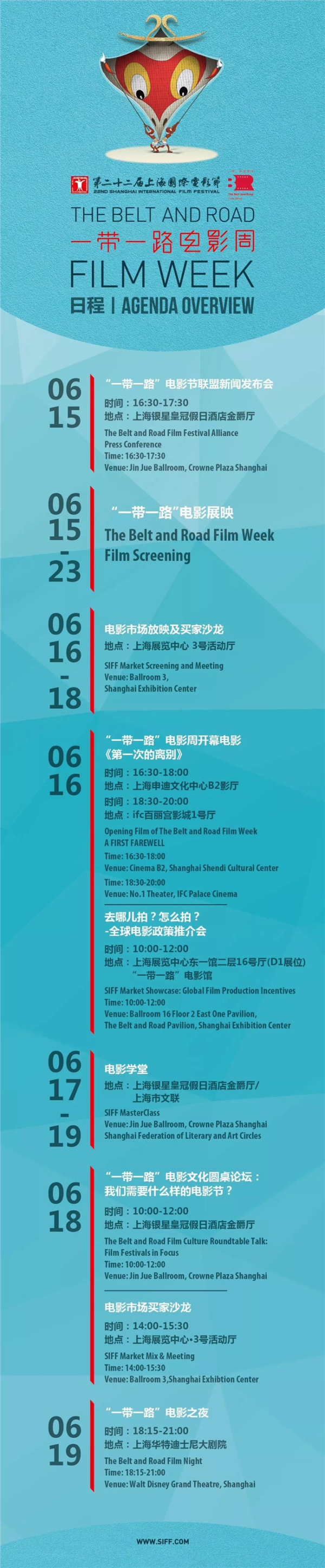 今年“一帶一路”電影周的活動包括:電影展映與見面會,“一帶一路”電影節(jié)聯(lián)盟新聞發(fā)布會,電影市場放映及買家沙龍,“一帶一路”電影周開幕電影,去哪兒拍?怎么拍?— 全球電影政策推介會,電影學堂,“一帶一路”電影文化圓桌論壇,“一帶一路”電影之夜等。