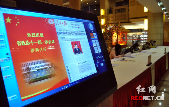 而在委員下榻的九所賓館、湖南賓館、喜迎賓華天大酒店、瀟湘華天大酒店四個酒店大廳入門處,則有一部巨大的電子閱讀屏。據(jù)工作人員介紹,這是湖南省圖書館為政協(xié)委員們設(shè)置的,隨時可以翻閱當(dāng)天的新聞。