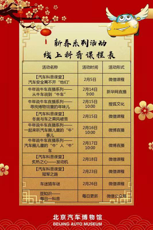 據(jù)北京汽車博物館相關(guān)負責(zé)人介紹,初三至初六以“牛年說牛車”為主題,每天一場直播講述汽車圈兒里的“牛”車、牛人、牛事兒。初三,科普老師講帶領(lǐng)大家從古代的牛車講到現(xiàn)在的“!避;初四,汽車博物館工作人員將帶領(lǐng)大家尋找汽博館里的年味兒,逛一逛博物館里的新春文創(chuàng)節(jié);初五,講解員以角色扮演的方式為大家?guī)硪粓銮榫笆街v解;初六,以新年特展“那些年,在路上”為主線帶大家看一看各個年代的經(jīng)典車型,聊一聊汽車圈兒里的“!比恕芭!笔聝。