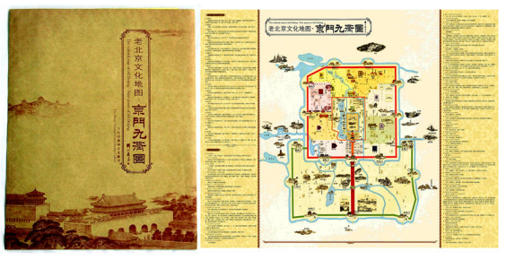 ◆地圖正面采用二維形式將紫禁城的宮殿格局、“內(nèi)九外七皇城四”二十座城門及北京各條道路更直觀的展示出來,并將北京文物古跡及景點(diǎn)采用國(guó)畫小圖形式添加在相應(yīng)地理位置。兩側(cè)用文字講述了北京城門的前生今世、北京歷史變遷等。圖文搭配可以讓人更直觀的了解老北京歷史格局。