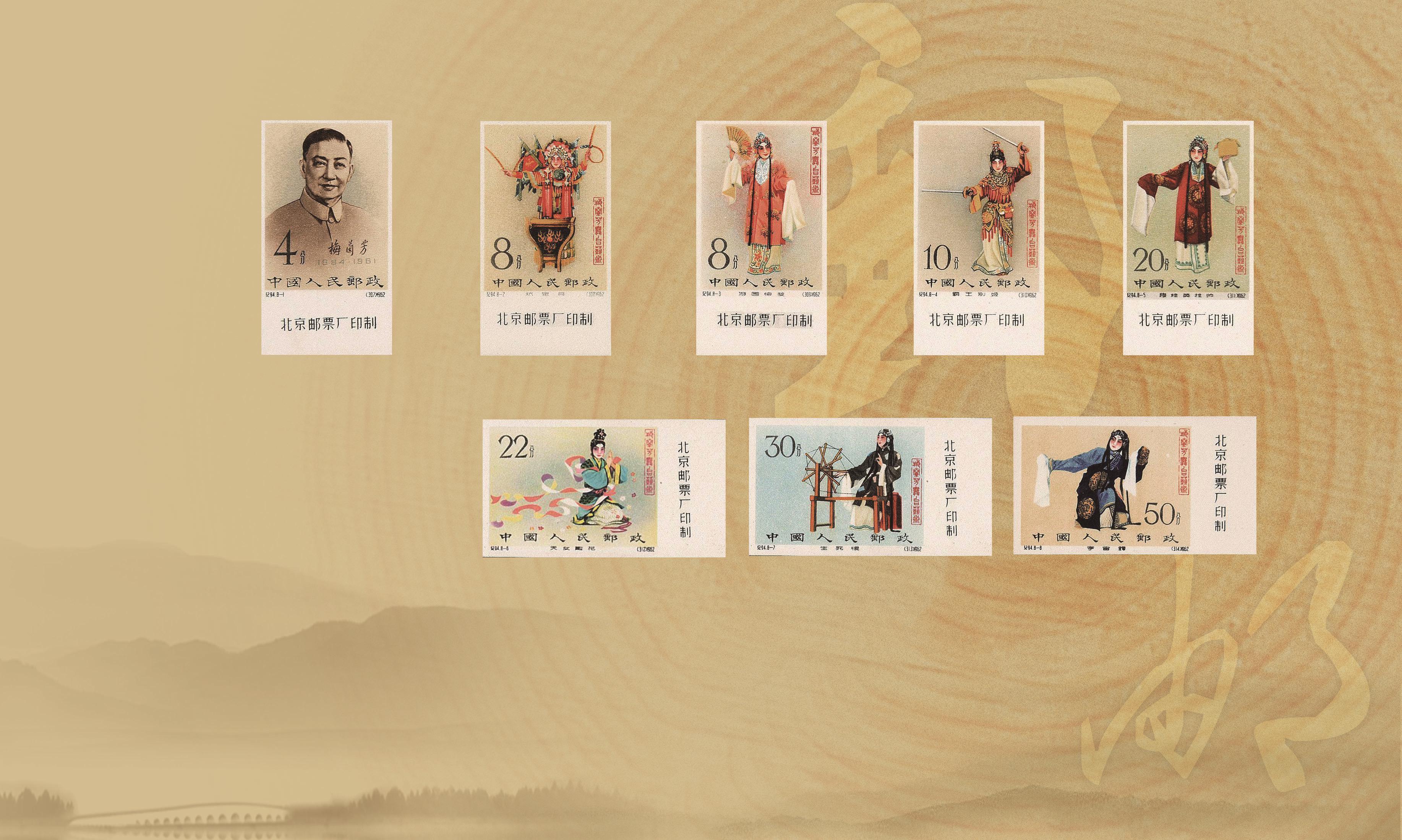 1962年8月8日,為紀(jì)念梅蘭芳先生逝世一周年,中華人民共和國(guó)郵電部于1962年8月8日發(fā)行了一套“梅蘭芳舞臺(tái)藝術(shù)”郵票,包括一枚小型張(1962年9月15日發(fā)行)。