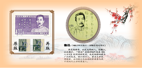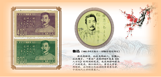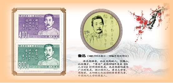 郵票中的魯迅像是根據(jù)魯迅遺像創(chuàng)作而成,寬闊的前額,襯托出魯迅大海般的胸懷;緊閉的嘴唇和深邃的目光,顯示出他憂國憂民的心情。圖案展現(xiàn)了一個立場堅定、愛憎分明的共產(chǎn)主義戰(zhàn)士的光輝形象;適度夸張的頭發(fā)和胡須,構(gòu)成他典型的外貌特征,含蓄地表現(xiàn)出了魯迅那超人的智慧和思想家的風(fēng)度。