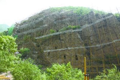 姚家營洞穴遺址近日啟動(dòng)修繕,崖壁外側(cè)搭建起高48米、寬130米的腳手架。延慶區(qū)文委供圖