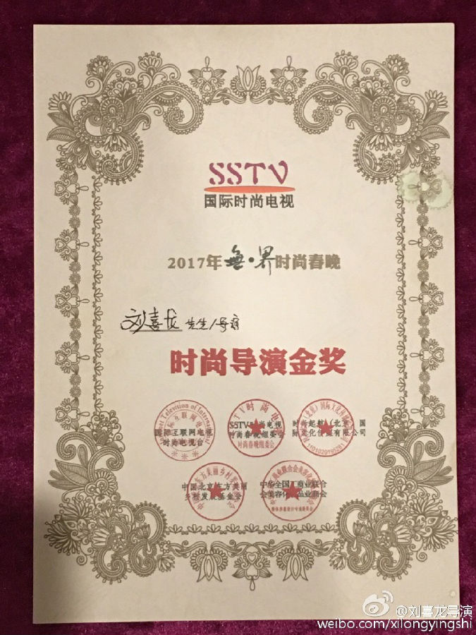 不僅在舞臺(tái)導(dǎo)演方面,2017年5月,在中國(guó)國(guó)際形象節(jié)暨時(shí)尚人物頒獎(jiǎng)盛典上劉喜龍獲得中國(guó)美業(yè)杰出貢獻(xiàn)獎(jiǎng)。