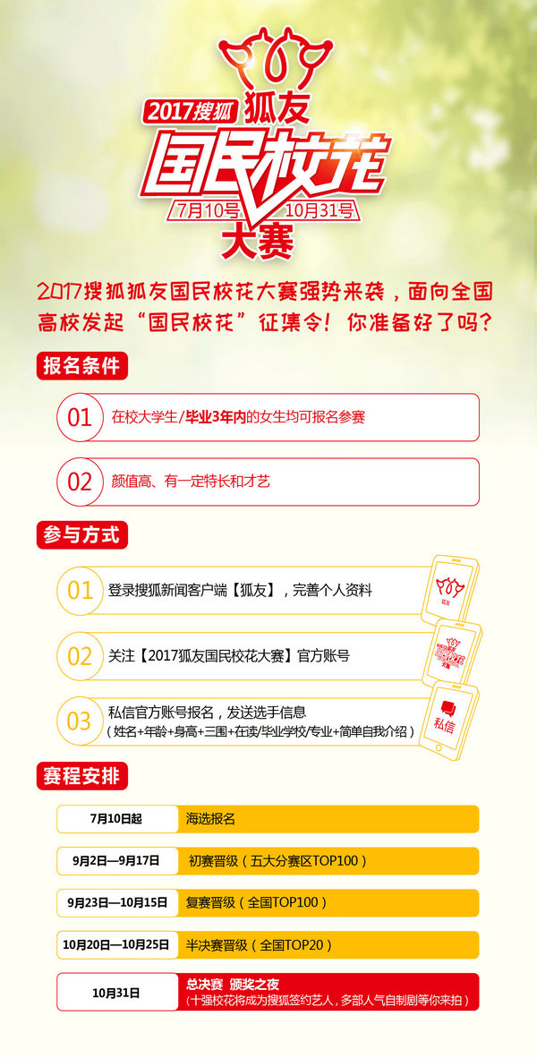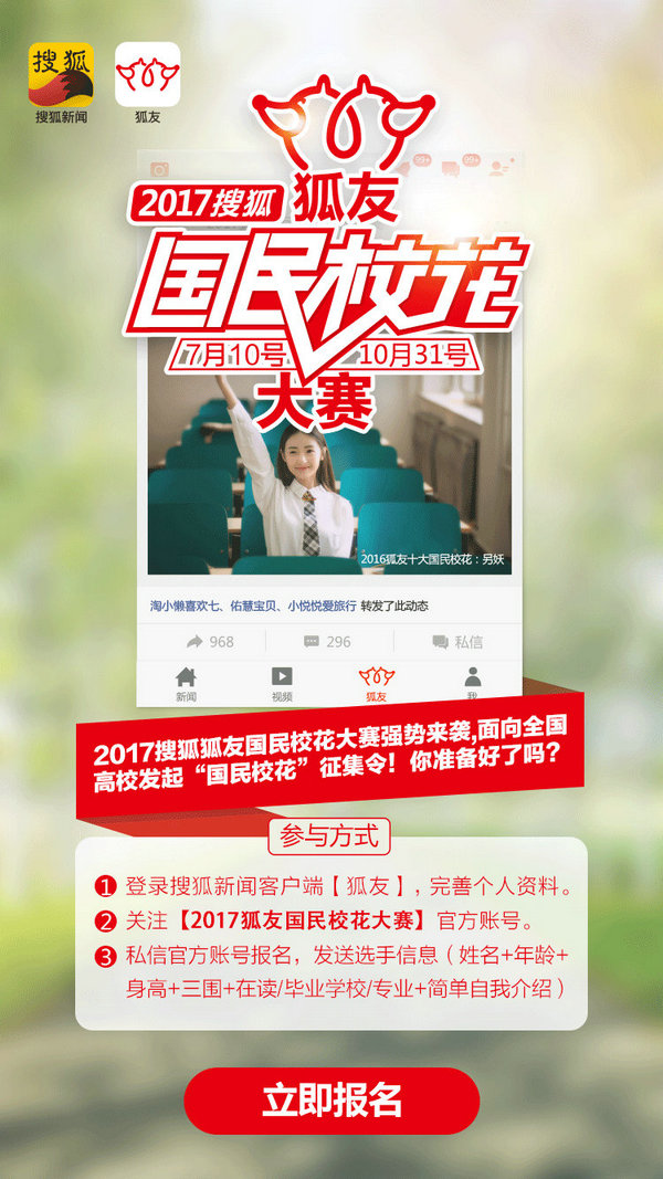 參賽要求十分簡單:在校大學(xué)生或畢業(yè)3年內(nèi)的女生,只需要“登錄”狐友完善個人資料,并關(guān)注“2017狐友國民;ù筚悺惫俜劫~號,私信發(fā)送報名信息(學(xué)校/畢業(yè)學(xué)校、三圍、身高、年齡),3天之內(nèi),與官方賬號“2017狐友國民校花大賽”互關(guān),即可獲得參加海選的資格。