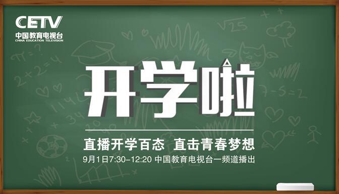《開學啦!》大型直播特別節(jié)目將于9月1日7:30-12:20在中國教育電視臺一頻道播出,中國教育網絡電視臺、今日頭條、等網絡平臺同步直播,敬請關注。