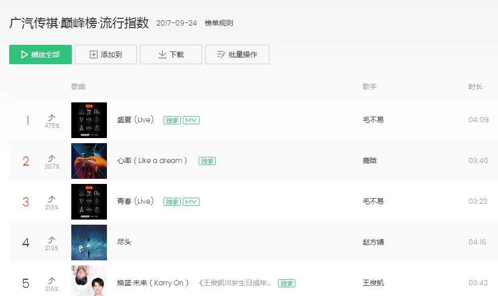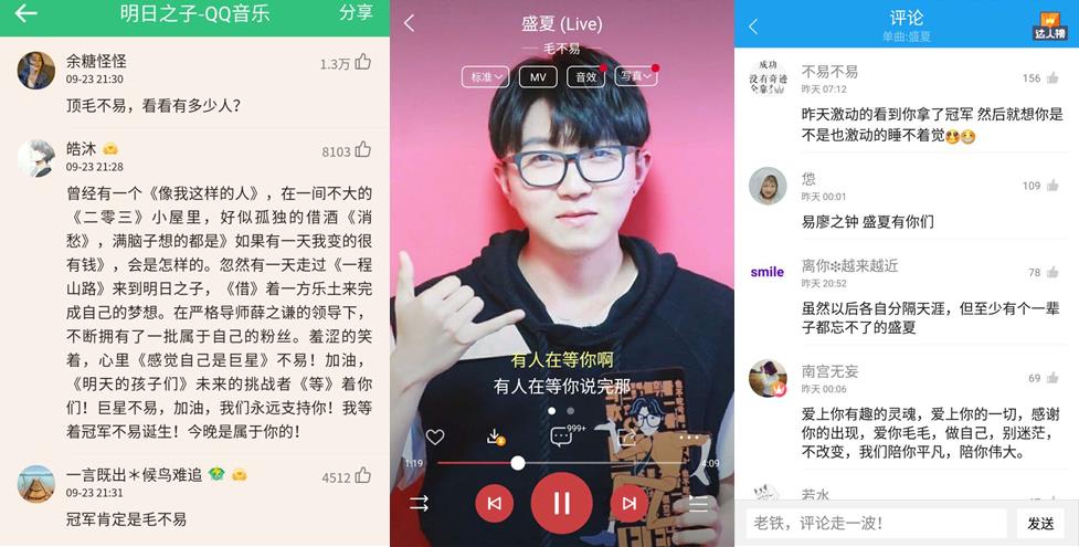 對于選手們精彩絕倫的表現(xiàn),網(wǎng)友們紛紛通過QQ音樂、酷狗音樂、酷我音樂應(yīng)援打氣,999+熱評歌曲不斷涌現(xiàn),熱評點贊數(shù)更是動輒破萬。最終,在人氣值比拼中,毛不易以微弱優(yōu)勢打敗馬伯騫,眾望所歸贏得《明日之子》最強(qiáng)廠牌殊榮,獲得白金唱片,奪冠曲《盛夏》更是力壓鹿晗和王俊凱、躥上QQ音樂巔峰榜流行指數(shù)榜首。從盛夏到初秋,在《明日之子》的未來偶像孵化過程中,騰訊音樂娛樂也充分玩轉(zhuǎn)“聽看唱玩”的“鵝式綜藝精神”,為粉絲們打造極具凝聚力的立體參與感。