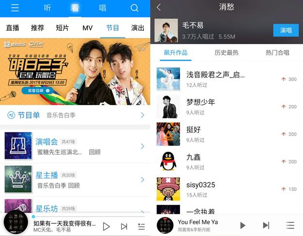 除了有同步節(jié)目進(jìn)度的王牌功能“零時差專輯”帶來一手好音樂,騰訊音樂娛樂彈幕、熱評多管齊下,也為粉絲們提供了邊聽邊聊的應(yīng)援、熱議陣地,實時反饋選手人氣的權(quán)威榜單更是為粉絲們提供了選手晉級幾率的直觀參考。此外,酷狗星樂坊、QQ音樂唱反調(diào)電臺等王牌欄目的“突襲”,也不定時讓選手們“空降”到網(wǎng)友面前,酷狗酷我便捷的K歌、直播頻道也為粉絲們一解了歡唱偶像歌曲的K歌癮。