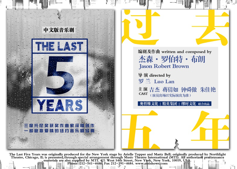 音樂劇《過去五年》由三度獲得托尼獎的杰森·羅伯特·布朗于2001年創(chuàng)作,講述了一對戀人在五年間的情感波折。音樂與故事的完美結(jié)合,正敘和倒敘穿插的雙線敘事,使這出劇獲得了紐約劇評人和觀眾的一片好評,并一度成為全球被排演次數(shù)最多的音樂劇之一。2015年,該劇被搬上電影銀幕,由安娜·肯德里克和杰瑞米·喬丹主演。