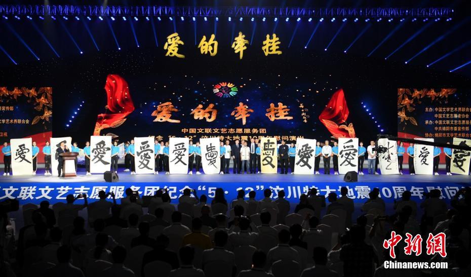 5月7日晚,“5.12”汶川特大地震10周年之際,中國文聯(lián)組織文藝名家走進(jìn)四川綿陽,拉開了“愛的牽掛”序幕;顒(dòng)現(xiàn)場,志愿者們贈(zèng)送了12幅寫著“愛”字的書法作品,同時(shí)還贈(zèng)送攝影和書畫作品。張國立、張凱麗、康輝、張蕾、姜昆、張也、李丹陽、呂繼宏、佟麗婭、霍勇等藝術(shù)家以文藝志愿者身份,現(xiàn)場為觀眾獻(xiàn)上了精彩的文藝表演。據(jù)悉,為更好地服務(wù)廣大攝影愛好者,中國攝影家協(xié)會(huì)慰問小分隊(duì)還深入北川等地舉辦攝影培訓(xùn)講座,吸引了當(dāng)?shù)馗鹘缑癖姶?000余人參加。劉忠俊 攝