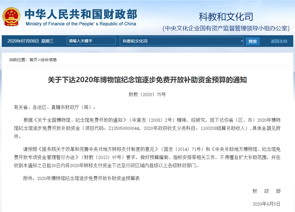 《通知》強(qiáng)調(diào),各。▍^(qū)、市)需按照《國務(wù)院關(guān)于改革和完善中央對地方轉(zhuǎn)移支付制度的意見》(國發(fā)〔2014〕71號)和《中央補(bǔ)助地方博物館、紀(jì)念館免費(fèi)開放專項(xiàng)資金管理暫行辦法》(財(cái)教〔2013〕97號)要求,做好預(yù)算編制、指標(biāo)安排等相關(guān)工作,不得擅自擴(kuò)大補(bǔ)助范圍,并在收到《通知》之日起30日內(nèi)將2020年轉(zhuǎn)移支付資金下達(dá)至行政區(qū)域內(nèi)縣級以上各級財(cái)政部門。