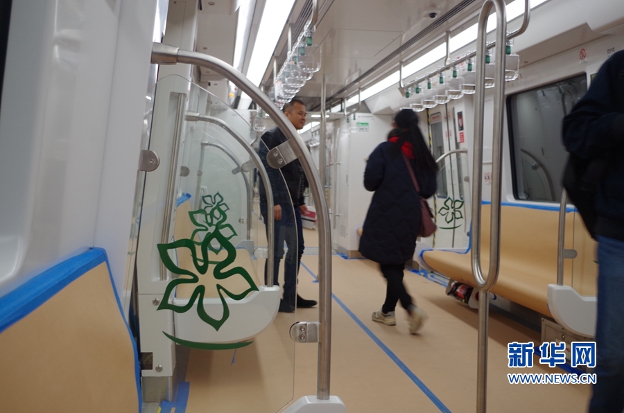 福州地鐵2號線線路設(shè)計以“綠色榕城 清新福州”為主題,“榕城綠”貫穿于整個車輛設(shè)計中。圖為列車座位透明擋板上裝飾的茉莉花圖標(biāo)。新華網(wǎng) 張婷婷 攝