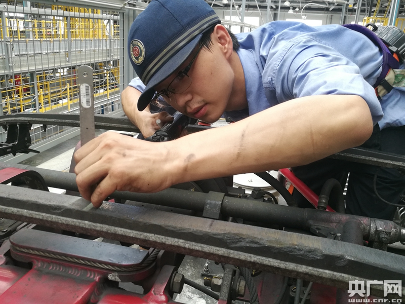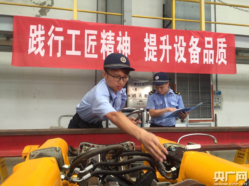 動(dòng)車(chē)組專(zhuān)用設(shè)備維修工在維護(hù)動(dòng)車(chē)組輪輞探傷機(jī)(央廣網(wǎng)發(fā) 通訊員孫文龍 攝)
