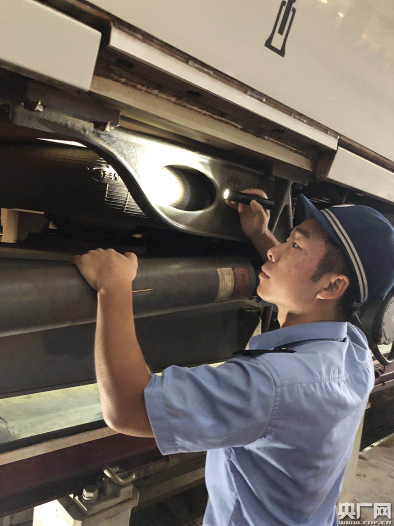 地勤機(jī)械師在動(dòng)車(chē)組側(cè)邊檢查空氣彈簧狀態(tài)(央廣網(wǎng)發(fā) 通訊員孫文龍 攝)