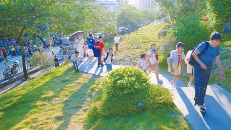 夕陽西下,公園里歡聲笑語不絕。這個(gè)建在家門口的“口袋公園”,正悄悄改變著居民的日常生活。