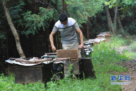 7月22日,陳村蜂農(nóng)在養(yǎng)蜂場(chǎng)進(jìn)行日常管理。 新華社發(fā)(陳柏材 攝)